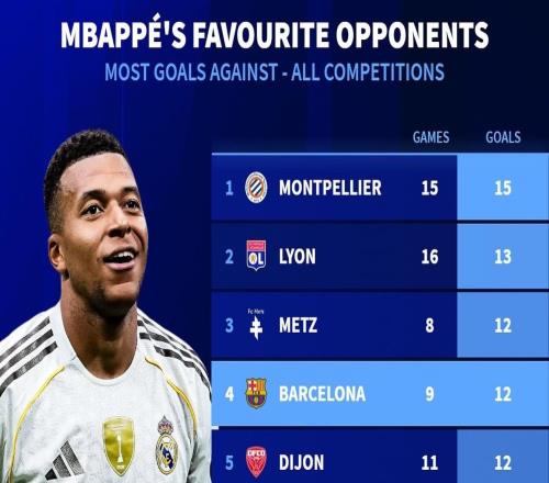 德转列姆巴佩进球最多的对手球队:蒙彼利埃居首,巴萨第四