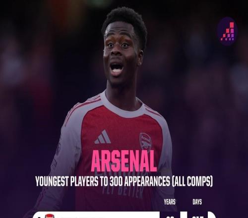 24岁180天,萨卡是达成阿森纳生涯300场第四年轻的球员