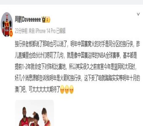雷速体育10月13报道 根据媒体人周鹏社交媒体透露像中国赛这样的NBA全球赛事,基本是提前1-2年定下对阵和比赛地,之前官宣今年是篮网和太阳时,好几个消息源都告诉他明年是火箭和独行侠。