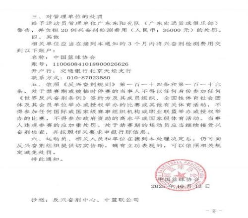 雷速体育10月13报道 根据中国篮协官方的公示,对于上个赛季效力广东队大外援吉伦沃特兴奋剂违规处理结果正式公示。