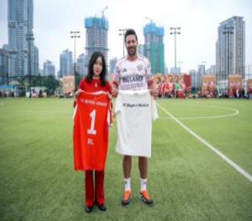 跨界点燃激情,用体育精神对话。菲姐代表AL来到绿茵场上与拜仁慕尼黑传奇皮萨罗互赠球衣与队服并合影留念。