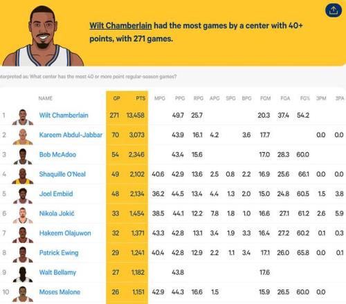 据统计,本场比赛是约基奇职业生涯第33次砍下40+得分,他超越了奥拉朱旺,成为NBA历史上单场40+得分场次数第六多的球员。在他身前的分别是张伯伦(271)、贾巴尔(70)、麦卡杜(54)、奥尼尔(49)和恩比德(48)。