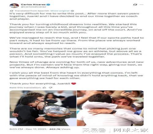 近日,现世界第一阿尔卡拉斯突然通过社交媒体宣布,结束与自己相伴七年的教练的合作关系,舆论瞬间哗然。