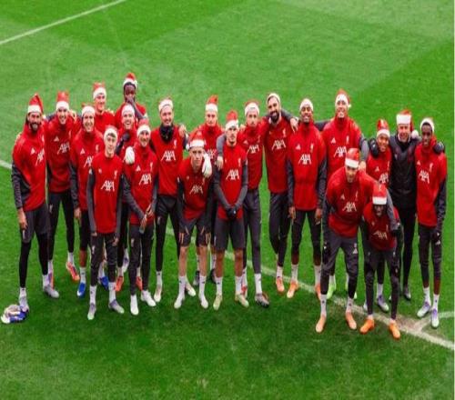 当地时间12月24日上午,利物浦球员戴上圣诞帽参加训练,并且进行了传统的合影。