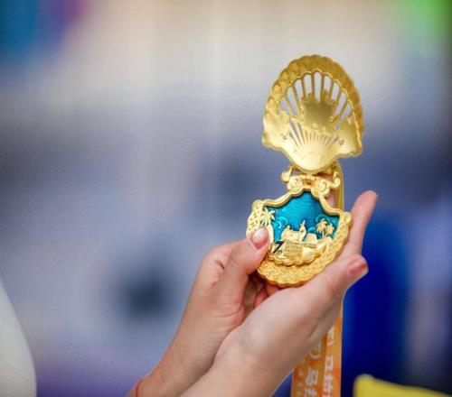 奖牌正面大面积镂空通透如浪,启合间可窥见天涯海角、鹿回头、南天一柱等三亚地标盛景,搭配可拆卸海螺造型磁吸配件,既可与奖牌融为一体彰显荣誉,也可单独作为冰箱贴使用,兼具纪念意义与实用价值。