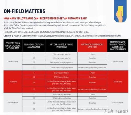 根据英超官网公布的规则,第19轮之前,得到5张黄牌的球员,需要自动停赛一场,第32轮之前,得到10张黄牌的球员,需要自动停赛两场,整个赛季中,得到15张黄牌的球员,需要自动停赛三场,至于得到20张黄牌以上的球员,则要通过相关的纪律委员会做出相关的处罚。而且,累积黄牌停赛,只能在英超联赛中执行,不能在国内杯赛接受处罚。
