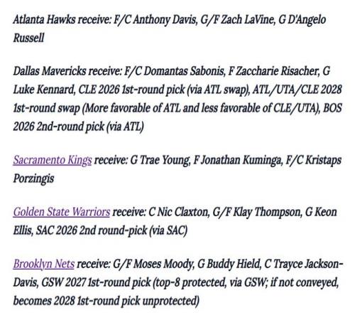 独行侠获得:多曼塔斯·萨博尼斯、里萨谢、肯纳德、2026年克里夫兰骑士队首轮选秀权(老鹰)、亚特兰大/犹他爵士/其他联盟球队2028年首轮选秀权交换权(老鹰拥有更有利的交换顺位)、2026年波士顿凯尔特人队次轮选秀权(老鹰)