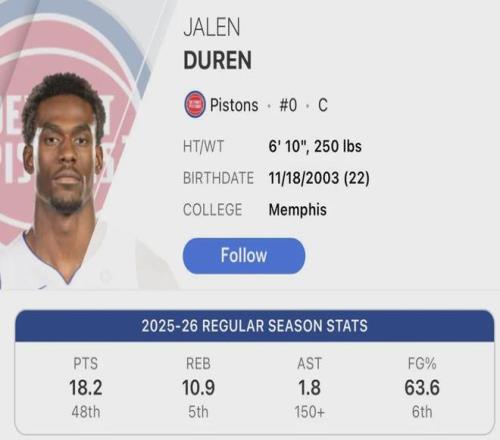 杜伦本赛季18次两双,联盟第五,仅次于约基奇(28)、唐斯(22)、杰伦-约翰逊(22)和吉迪(19)。场均正负值+6.5,联盟第20,活塞队内第二,仅次于坎宁安(+7.1)。场均内线得分13.5,联盟第3,仅次于约基奇和申京。