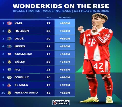 德转列2025年身价涨幅最高的U21球员TOP10: