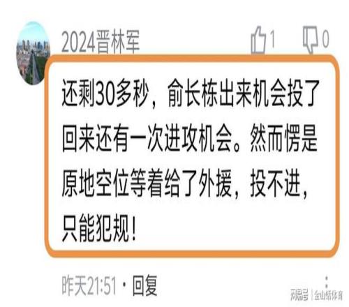 许多球迷质疑俞长栋的空位不敢投。“还剩30多秒,俞长栋出来机会投了回来还有一次进攻机会。然而愣是原地空位等着给了外援,投不进,只能犯规!”;“输在最后俞长栋3分空位出机会不敢投。”;“俞长栋真是牛,空位都不投。”……