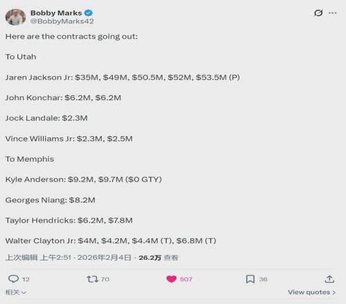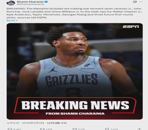 2025年休赛期,灰熊5年2.4亿美元续约小贾伦-杰克逊,刚过半年就把他给交易了。灰熊交易3J毫无征兆,此前球队一直把莫兰特摆上货架,到现在莫兰特还在灰熊,结果3J却被清理了。灰熊显然是要重建,用贝恩和3J换来7个首轮。
