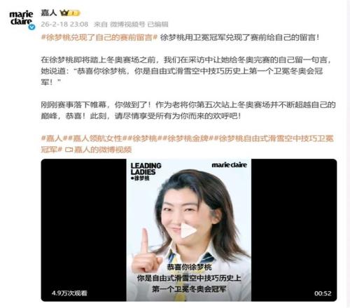 她说:“恭喜你徐梦桃,你是自由式滑雪空中技巧历史上第一个卫冕冬奥会冠军!”