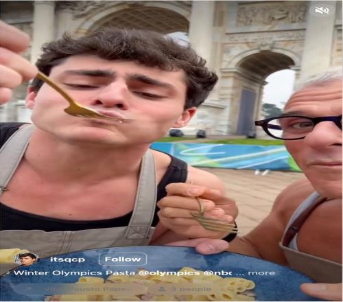 NBC邀请了Gianluca Conte (@itsQCP) 前往开幕式、演播室和各种活动现场,这位颇受欢迎的网红将视频发布到他的Instagram故事中,与他的340万粉丝分享。他以烹饪内容闻名,这次还发布了一段与一位意大利厨师合作的视频,他们用奥运五环意面制作了一道菜肴,并在和平拱门前的奥运圣火旁享用了这道菜。“这比他写‘这是我在米兰-科尔蒂纳冬奥会的每日博客’要真实得多。”Karapetyan说。