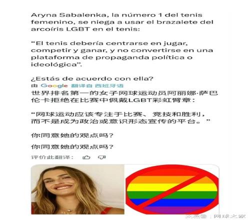 近日,一则帖子在外网疯狂传播。帖主声称,阿琳娜·萨巴伦卡已“拒绝在未来赛季的比赛中佩戴LGBT彩虹手环”,并配以强硬的言辞阐述其立场:“网球应该专注于比赛、竞争与胜利,而不是成为政治或意识形态宣传的平台。”