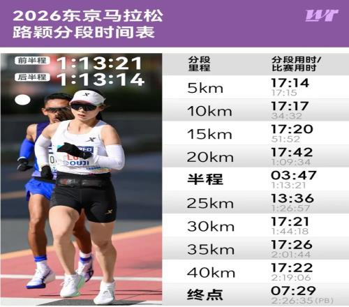 七位中国女精英出战东京,来自河南队的路颖如愿PB,也是此次东马完赛最快的中国女选手。2:26:35——这是路颖交出的大满贯首秀成绩单。比之2025年无锡马拉松跑出的2:27:30快了55秒。这55秒的进步,是路颖用前半程1:13:21后半程1:13:14的负配速跑出来的。她说,自己东京之行的一大收获就是跑出一场“负配速”比赛,这在自己过去的比赛中很少经历。
