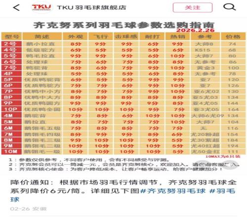 此外,2月24日,斯庄格运动互动旗舰店公告称决定对全系列羽毛球降价5元-10元/筒。2月26日,齐克努羽毛球旗舰店发布降价通知,齐克努羽毛球全系列降价6元/筒。