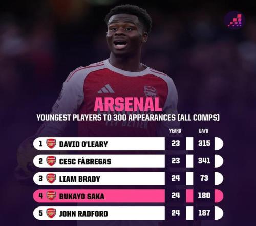 英超第29轮,阿森纳客场对阵布莱顿,24岁的萨卡迎来阿森纳生涯第300次出场,成为达成这一里程碑第四年轻的球员。