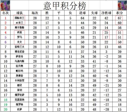 积分榜方面,AC米兰今天击败国米后,多少还是挽留了些争冠悬念,将和国米的分差拉回到个位数,10轮追7分还是有机会的。那不勒斯差国米11分排在第3。争四很激烈,黑马科莫净胜球优势力压罗马位列前4,尤文1分之差排在第5。