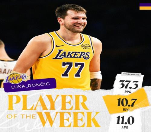 湖人后卫东契奇当选西部周最佳球员。这是他本赛季第3次获此殊荣,职业生涯第18次当选。