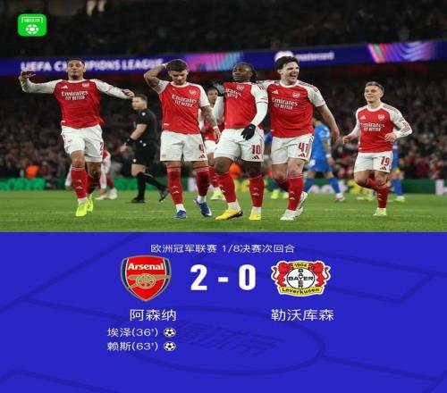 北京时间3月18日欧洲冠军联赛 1/8决赛次回合,阿森纳对阵勒沃库森。上半场埃泽破门,特罗萨德屡次打门造险,下半场赖斯扩大比分,拉亚救险。最终比分阿森纳 2-0 勒沃库森。两回合总比分阿森纳3-1勒沃库森。