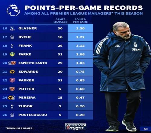 本赛季英超主帅场均积分(至少执教3场):